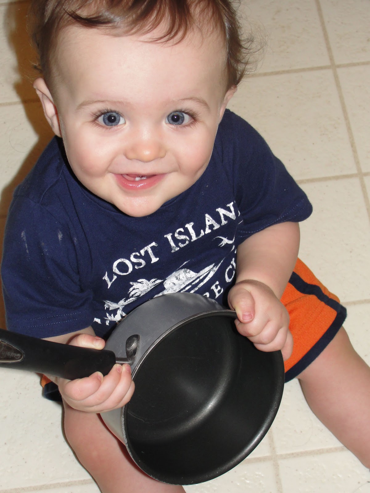 I opened up my laptop and checked this blog that a girl I went to high school with writes. I have been checking it everyday since I came across it two weeks ago. It's the saddest thing. Her 4 month old daughter passed away two and a half weeks ago from what they think was SIDS. I don't check it to cry (although it did make me cry A LOT when I first started reading it). I really just want to see how she's doing. I can't fathom that kind of pain. I have had loss in my life, but nothing could compare to the loss of a child. Your child. So as I'm reading how she is struggling to go to the grocery store because everyone has a baby, I am reminded to stop and be thankful. Was today stressful? yes. But at least I had today. I had today with my son and my husband. I had today with my friends at work and my students that rely on me. I bounced Joel on my knee and made him crack up laughing, and I took some pretty cute pictures of him playing "sous chef" in the kitchen.